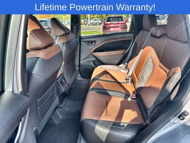 Forester Touring is nicely equipped with Standard Model, 11 Speakers, 4-Wheel Disc Brakes, ABS brakes, Air Conditioning, AM/FM radio: SiriusXM with 360L, Auto High-beam Headlights, Automatic temperature control, Body Side Molding - Ice Silver Metallic, Brake assist, Center Console Tray, Driver door bin, Driver vanity mirror, Electronic Stability Control, Exterior Parking Camera Rear, Four wheel independent suspension, Front Bucket Seats, Front Center Armrest, Front dual zone A/C, Front fog lights, Front reading lights, Fully automatic headlights, Heated & Ventilated Front Bucket Seats, Heated door mirrors, Heated front seats, Heated steering wheel, HVAC memory, Illuminated entry, Leather steering wheel, LED Upgrade, Memory seat, Navigation System, Outside temperature display, Overhead console, Panic alarm, Passenger door bin, Passenger vanity mirror, Perforated Leather-Trimmed Upholstery, Power door mirrors, Power driver seat, Power Liftgate, Power moonroof: Panoramic, Power passenger seat, Power steering, Power windows, Rear seat center armrest, Rear window defroster, Rear window wiper, Remote keyless entry, Security system, Speed control, Speed-sensing steering, Split folding rear seat, Steering wheel mounted audio controls, Tachometer, Telescoping steering wheel, Tilt steering wheel, Traction control, Trip computer, Turn signal indicator mirrors, Variably intermittent wipers, Ventilated front seats, Wheels: 19 x 7.5 J Dark Gray Aluminum-Alloy, Alloy wheels, Anti-whiplash front head restraints, Bumpers: body-color, Dual front impact airbags, Dual front side impact airbags, Front anti-roll bar, harman/kardon® Speakers, Heated rear seats, Knee airbag, Low tire pressure warning, Occupant sensing airbag, Overhead airbag, Radio data system, Rear anti-roll bar, and Spoiler.