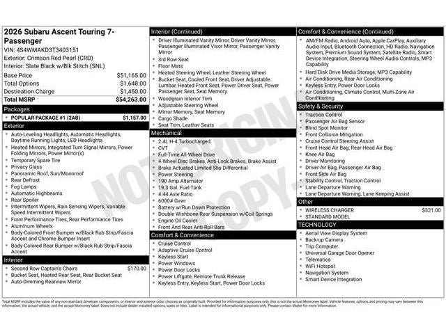Ascent Touring is nicely equipped with Popular Package #1 (All-Weather Floor Liners, Cargo Tray, LED Upgrade, Rear Bumper Cover, and Splash Guards), Standard Model, 14 Speakers, 2nd Row Captain's Chairs Rear Seatback Protector, 3rd row seats: bench, 4-Wheel Disc Brakes, ABS brakes, Air Conditioning, Alloy wheels, AM/FM radio: SiriusXM with 360L, Apple CarPlay & Android Auto, Auto High-beam Headlights, Auto-dimming Rear-View mirror, Automatic temperature control, Brake assist, Bumpers: body-color, Compass, Delay-off headlights, Driver door bin, Driver vanity mirror, Dual front impact airbags, Dual front side impact airbags, Electronic Stability Control, Emergency communication system: MySubaru Companion (5-years free), Exterior Parking Camera Rear, Four wheel independent suspension, Front anti-roll bar, Front Bucket Seats, Front Center Armrest, Front dual zone A/C, Front fog lights, Front reading lights, Fully automatic headlights, Garage door transmitter: HomeLink, harman/kardon® Speakers, Heated door mirrors, Heated front seats, Heated rear seats, Heated steering wheel, HVAC memory, Illuminated entry, Knee airbag, Leather Shift Knob, Leather steering wheel, Low tire pressure warning, Memory seat, Navigation system: MySubaru Navigator (1-year trial), Occupant sensing airbag, Outside temperature display, Overhead airbag, Overhead console, Panic alarm, Passenger door bin, Passenger vanity mirror, Perforated Nappa Leather-Trimmed Upholstery, Power door mirrors, Power driver seat, Power Liftgate, Power moonroof, Power passenger seat, Power steering, Power windows, Radio data system, Rain sensing wipers, Rear air conditioning, Rear anti-roll bar, Rear reading lights, Rear window defroster, Rear window wiper, Reclining 3rd row seat, Remote keyless entry, Security system, Speed control, Speed-sensing steering, Split folding rear seat, Spoiler, Steering wheel mounted audio controls, Tachometer, Telescoping steering wheel, Tilt steering wheel, Traction control, Trip computer, Turn signal indicator mirrors, Variably intermittent wipers, Ventilated front seats, and Wireless Charger.