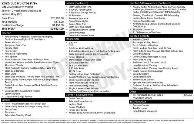Whether you're embarking on a weekend adventure or navigating the daily commute, the 2026 Subaru Crosstrek Base is the perfect companion. Experience the perfect blend of capability, comfort, and safety – visit our showroom today and discover the Crosstrek that's tailored to your lifestyle.
