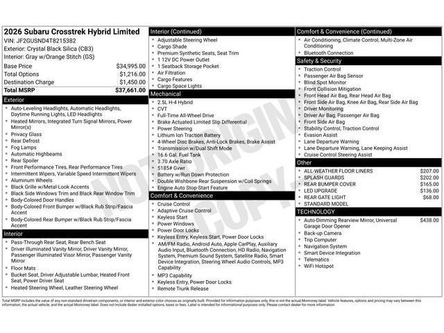 Whether you're navigating the urban jungle or tackling the great outdoors, the 2026 Subaru Crosstrek Hybrid Limited is the perfect companion. Its versatile design, with a rear bumper cover, splash guards, and all-weather floor liners, ensures that you can tackle any adventure with confidence.