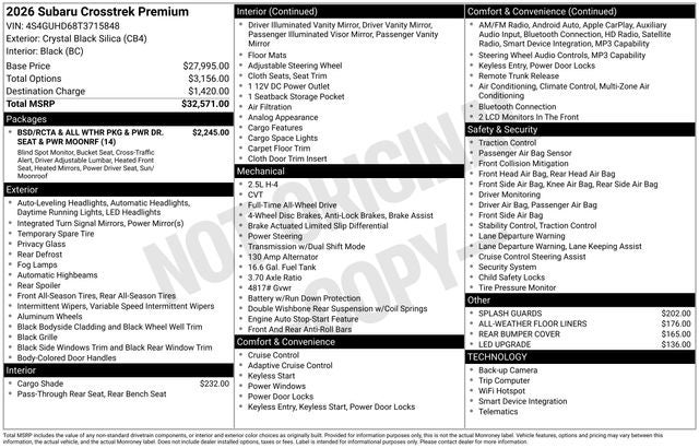 Crystal Black Silica 2026 Subaru Crosstrek Premium 4D Sport Utility AWD Lineartronic CVT 2.5L 4-Cylinder DOHC 16V 26/33 City/Highway MPG