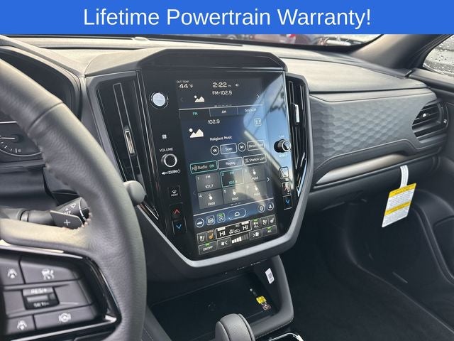 Forester Touring is nicely equipped with Standard Model, 11 Speakers, 4-Wheel Disc Brakes, ABS brakes, Air Conditioning, All-Weather Floor Liners, Alloy wheels, AM/FM radio: SiriusXM with 360L, Anti-whiplash front head restraints, Auto High-beam Headlights, Automatic temperature control, Brake assist, Bumpers: body-color, Cargo Net, Cargo Tray, Driver door bin, Driver vanity mirror, Dual front impact airbags, Dual front side impact airbags, Electronic Stability Control, Emergency communication system: MySubaru Companion (5-years free), Exterior Parking Camera Rear, Four wheel independent suspension, Front anti-roll bar, Front Bucket Seats, Front Center Armrest, Front dual zone A/C, Front fog lights, Front reading lights, Fully automatic headlights, harman/kardon® Speakers, Heads-Up Display, Heated door mirrors, Heated front seats, Heated rear seats, Heated steering wheel, HVAC memory, Illuminated entry, Knee airbag, Leather Shift Knob, Leather steering wheel, LED Upgrade, Low tire pressure warning, Memory seat, Navigation System, Occupant sensing airbag, Outside temperature display, Overhead airbag, Overhead console, Panic alarm, Passenger door bin, Passenger vanity mirror, Perforated Leather-Trimmed Upholstery, Power door mirrors, Power driver seat, Power Liftgate, Power moonroof: Panoramic, Power passenger seat, Power steering, Power windows, Radio data system, Radio: Subaru 11.6 Multimedia Navigation System, Rain sensing wipers, Rear anti-roll bar, Rear seat center armrest, Rear window defroster, Rear window wiper, Remote keyless entry, Security system, Speed control, Speed-sensing steering, Splash Guards, Split folding rear seat, Spoiler, Steering wheel mounted audio controls, Tachometer, Telescoping steering wheel, Tilt steering wheel, Traction control, Trailer Hitch, Trip computer, Turn signal indicator mirrors, Variably intermittent wipers, Ventilated front seats, and Wheels: 19 x 7.5 J Dark Gray Aluminum-Alloy.