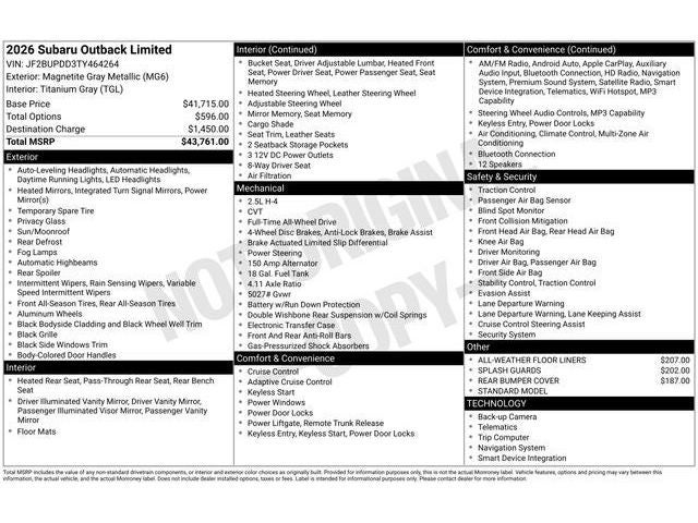 We invite you to experience the 2026 Subaru Outback Limited for yourself. Visit our showroom and let our knowledgeable team guide you through all the features and capabilities that make this SUV a true standout in its class. We're confident that once you take it for a test drive, you'll be captivated by its exceptional performance and uncompromising quality.