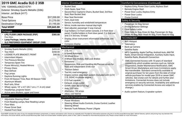 Smokey Quartz Metallic 2019 GMC Acadia SLE-2 4D Sport Utility AWD 6-Speed Automatic 2.5L 4-Cylinder DGI DOHC VVT
