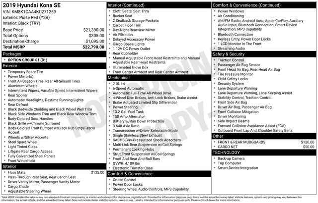 Pulse Red 2019 Hyundai Kona SE 4D Sport Utility AWD 6-Speed Automatic with Shiftronic I4 25/30 City/Highway MPG