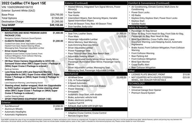 Summit White 2022 Cadillac CT4 Sport 4D Sedan AWD 8-Speed Automatic 2.0L Turbocharged 22/31 City/Highway MPG