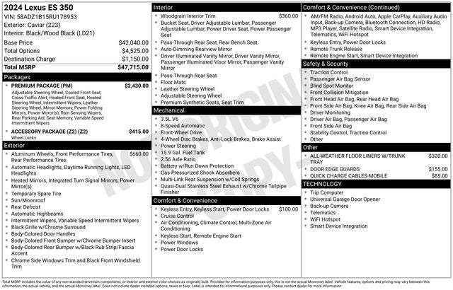 With its unparalleled craftsmanship, exceptional performance, and wealth of premium features, this 2024 Lexus ES 350 is the embodiment of luxury, sophistication, and reliability. Experience the difference for yourself by scheduling a test drive today. We're confident you'll be impressed by the exceptional value and exceptional ownership experience this Lexus has to offer.