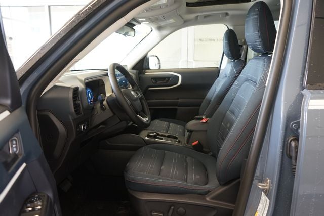 Bronco Sport Heritage is nicely equipped with Convenience Package (Front Driver/Passenger Seat Back Map Pockets, Heated 8-Way Power Driver's Seat, LED Fog Lamps, Premium Wrapped Steering Wheel, and Universal Garage Door Opener (UGDO)), Equipment Group 250A, 4-Wheel Disc Brakes, 6 Speakers, ABS brakes, Air Conditioning, Alloy wheels, AM/FM radio: SiriusXM, AM/FM Stereo, Auto High-beam Headlights, Automatic temperature control, Brake assist, Cargo Management System (Shelf/Divider/Table), Cargo Mat, Compass, Delay-off headlights, Driver door bin, Driver vanity mirror, Dual front impact airbags, Dual front side impact airbags, Electronic Stability Control, Emergency communication system: SYNC 4 911 Assist, Four wheel independent suspension, Front & Rear Floor Liners w/o Carpet Mats, Front anti-roll bar, Front Bucket Seats, Front Center Armrest, Front License Plate Bracket, Front reading lights, Fully automatic headlights, Heated door mirrors, Illuminated entry, Knee airbag, Low tire pressure warning, Occupant sensing airbag, Outside temperature display, Overhead airbag, Overhead console, Panic alarm, Passenger door bin, Passenger vanity mirror, Plaid Cloth Front Bucket Seats, Power door mirrors, Power Moonroof, Power steering, Power windows, Radio data system, Rear anti-roll bar, Rear Parking Sensors, Rear reading lights, Rear seat center armrest, Rear window defroster, Rear window wiper, Remote keyless entry, Security system, SiriusXM, Speed control, Speed-sensing steering, Speed-Sensitive Wipers, Split folding rear seat, Steering wheel mounted audio controls, SYNC 4 w/Enhanced Voice Recognition, Tachometer, Telescoping steering wheel, Tilt steering wheel, Traction control, Trip computer, Variably intermittent wipers, and Wheels: 17 Oxford White-Painted Aluminum.